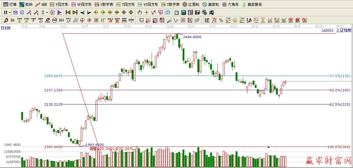 ★依据江恩波段百分比提示:135度位置2259短期有望触摸。关注后期这里的135度位置压力能否突破。