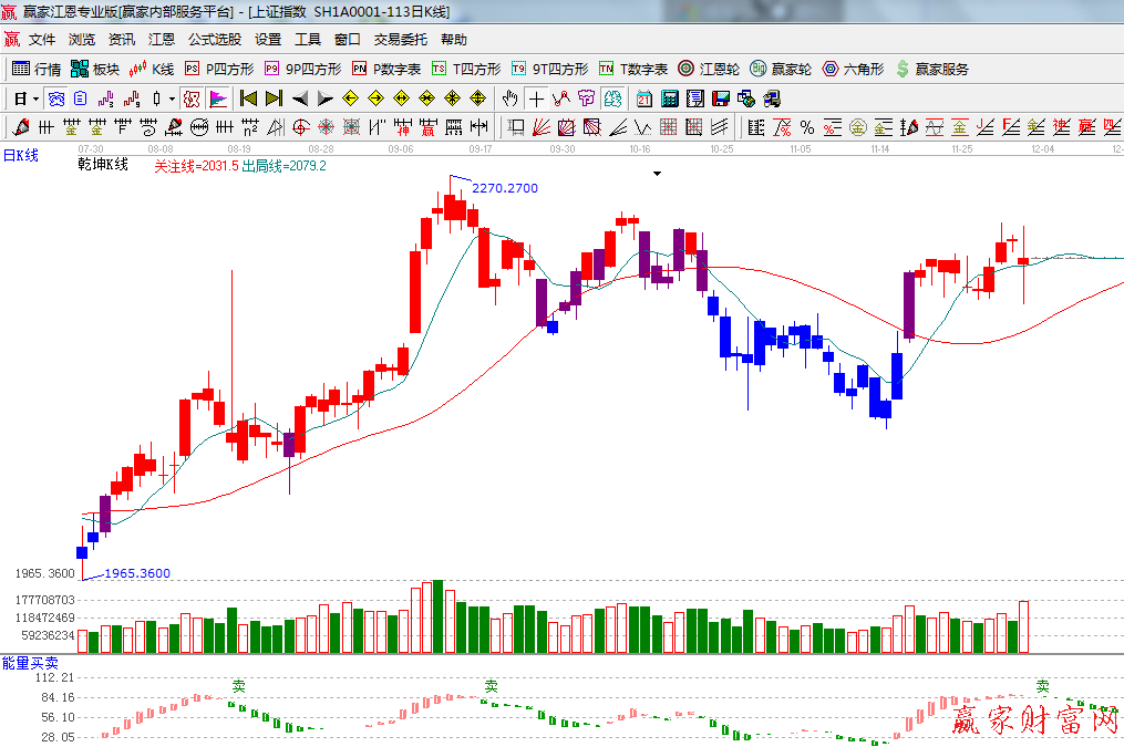 ☆依据赢家江恩系统能量买卖提示:多方量能红色柱子缩短,出现卖出信号看空;