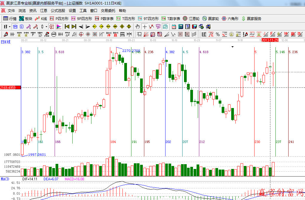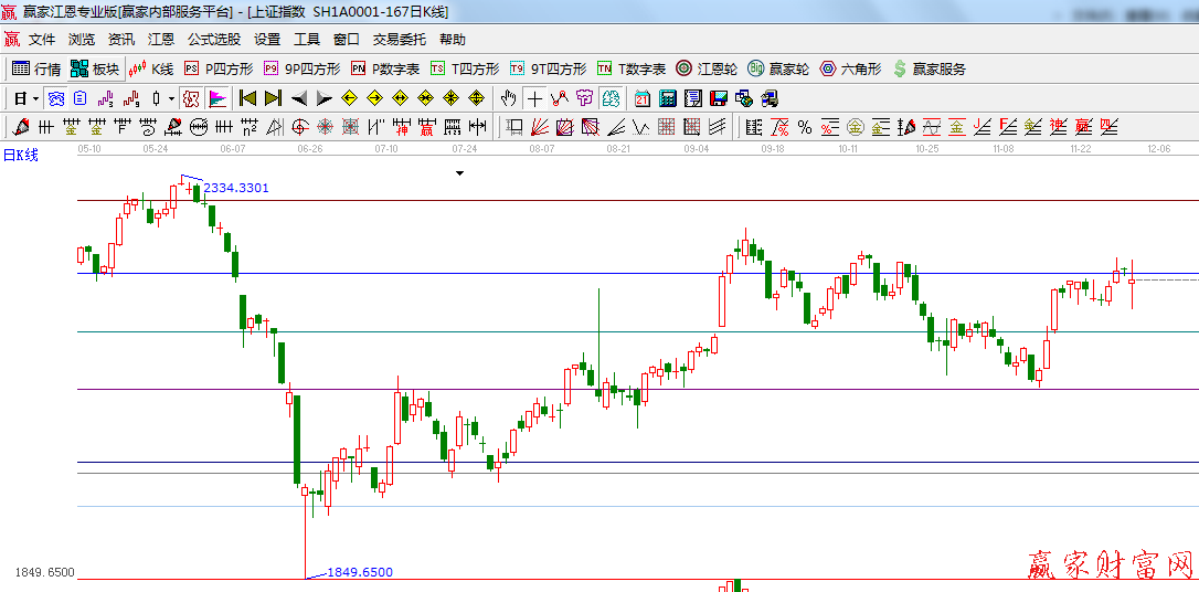 ☆依据赢家江恩系统波段百分比延伸提示:2444与1849点做黄金分割价格图,0.382位置是2217点,下方支撑为0.5位置2150,上方抛压在前期头部2265附近;