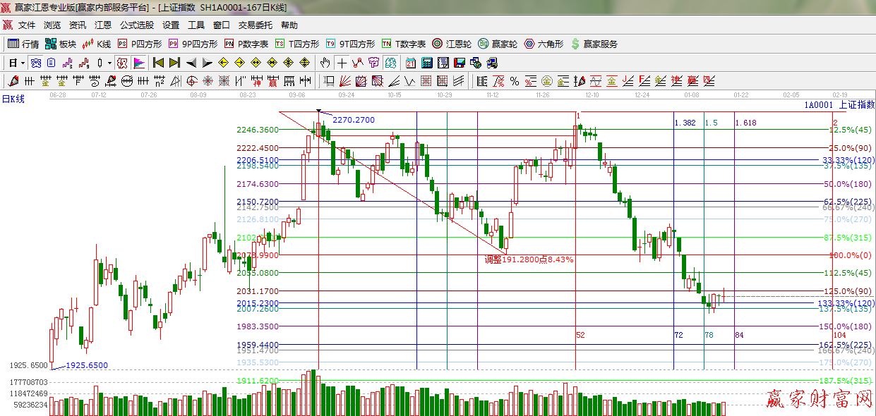 综上所述:依据赢家江恩技术工具分析得出:近期大盘在极反通道弱势下轨附近展开平台式反弹,在蓝筹股携手拉升下,量能略有放大,上方短期阻力依然留意江恩90度2031附近,第二阻力位45度2055附近,周五股指交割日,预计仍将维持震荡走势,操作方面,严格控制仓位,切勿盲目追高,稳健者等待为主。星级风险提示,谨慎做多。