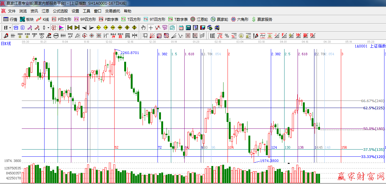 ☆依据赢家江恩系统波段百分比提示:围绕江恩180度位置震荡整理,收盘收于180度2060下方,此位置如不能收复,后期还将继续下行寻求支撑,下方支撑2030点,135度2007点,