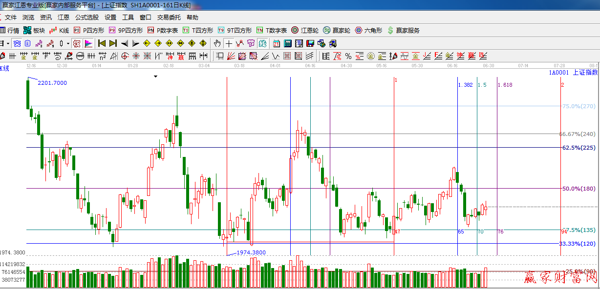 江恩看盘综述:依据赢家江恩技术工具分析得出:周五生命线遇阻回落,收阴十字星,量能有所放大,生命线2040不能突破短期依然震荡整 理或小幅下探,本周时间窗口7月2日附近,有望给出短期方向,操作上,仓位控制在3-5成。