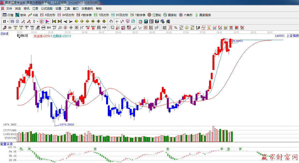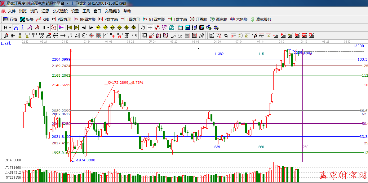 ★依据赢家江恩系统波段百分比提示:指数再次强势上涨,上方阻力180度2232点,225度,2254点