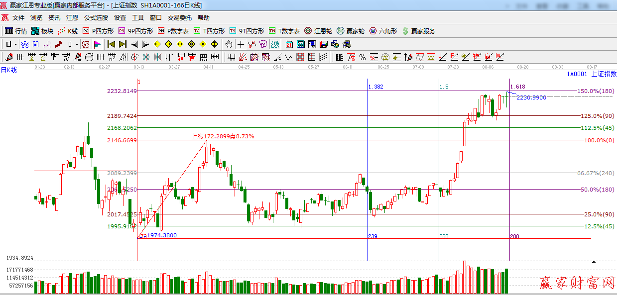 ★依据赢家江恩系统波段百分比提示:上方阻力180度2232点,225度,2254点。