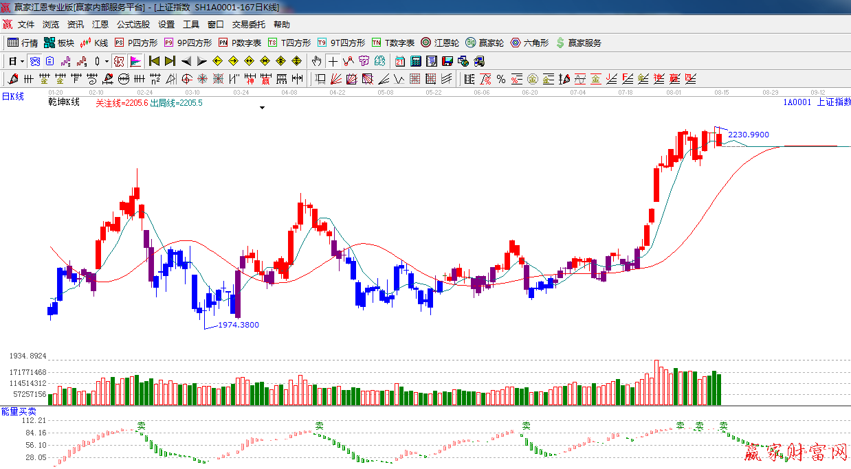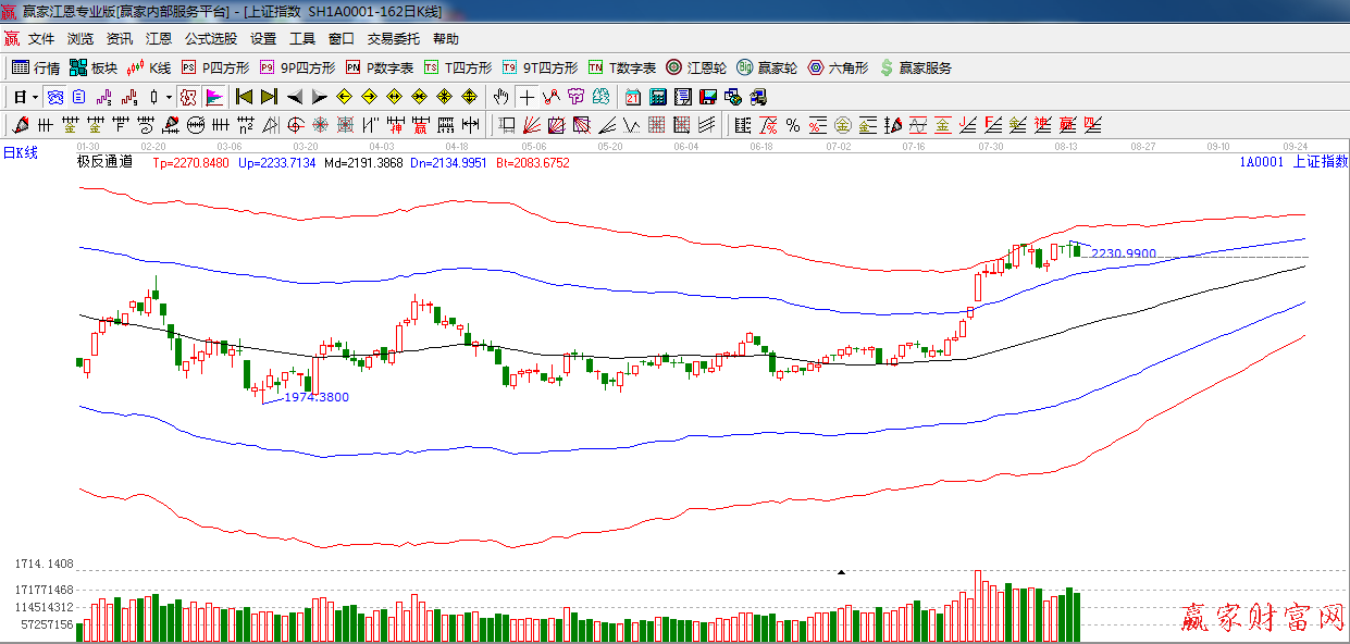 ★依据赢家江恩系统极反通道提示:大盘如期冲高回落,短期有回踩极反通道蓝色外轨线的需求,短期看空。
