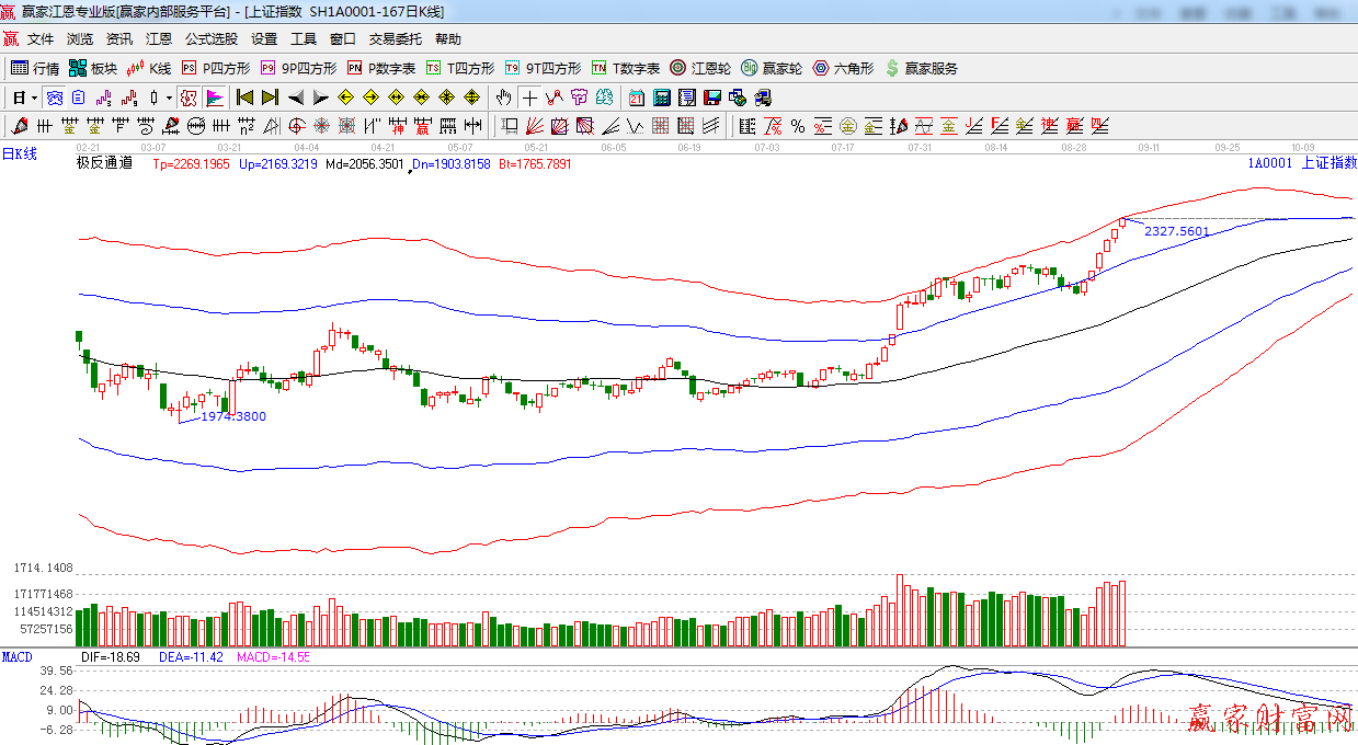 上周,沪深两市在资金推动下,呈单边上涨走势,连续突破2250点以及2300点两大阻力位,刷新年内新高,板块方面出现普涨,其中航天军工、港口等板块更是表现突出,截止周五收盘,上证指数已经站上了2326点,上周五又是前期提到的时间之窗,指数又面临上方极反通道红色外轨压力,短期将结束前期伶俐走势,转入震荡,预计本周将冲高回落,操作上,谨慎为主。