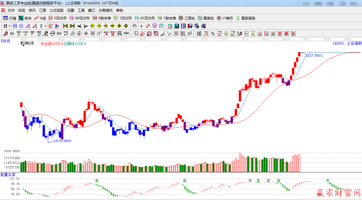 ★依据赢家江恩系统能量买卖提示:红色能量柱子,看多。