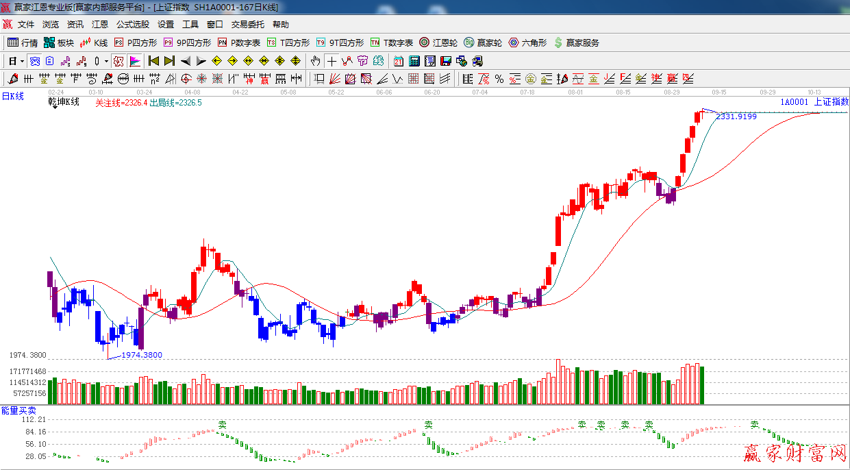 ★依据赢家江恩系统乾坤K线提示:k线由紫色转入红色k线,处于红色安全可操作区域,看多。
