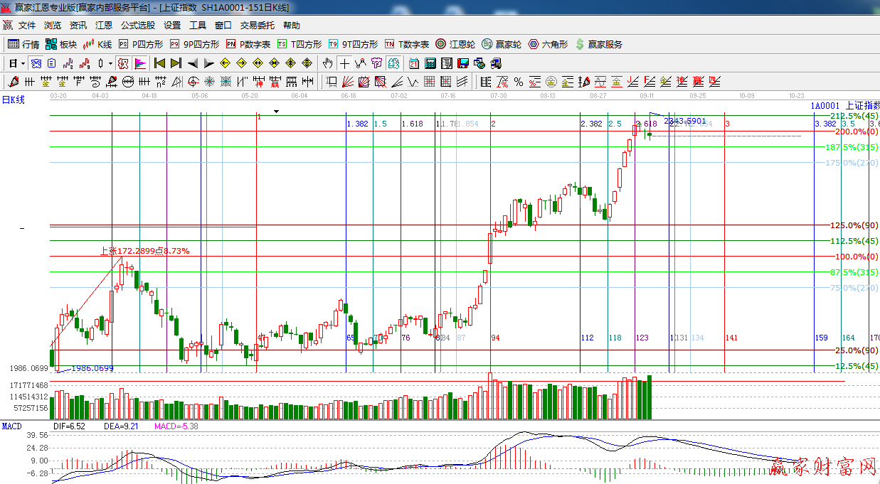 ★依据赢家江恩系统波段百分比提示:外轨线遇阻回落,下方支撑关注315度2297点,270度2275点。