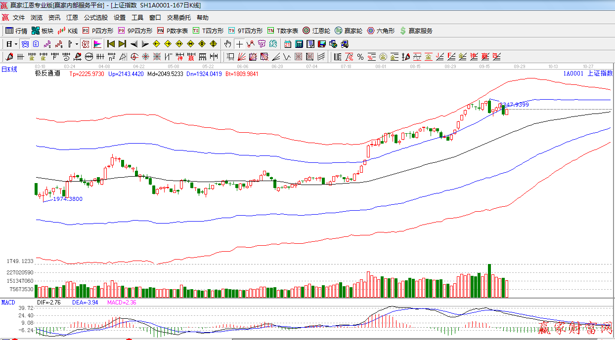 ★依据赢家江恩系统极反通道提示:缩量反抽极反通道蓝色外轨线 ,阻力2318点,明日继续关注此位置,短线看空,中线看多。