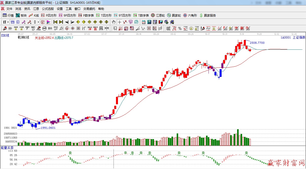★依据赢家江恩系统乾坤K线提示:红色区域,短线出局线之下,短线看空。