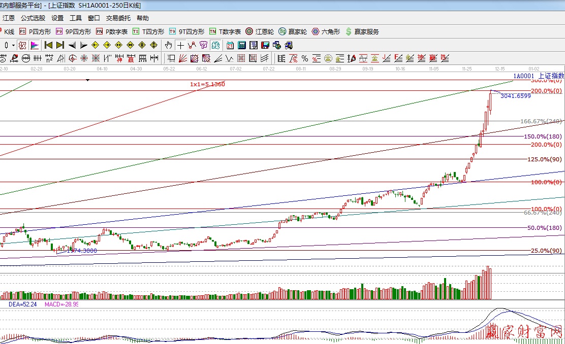 江恩看盘综述:依据赢家江恩技术工具分析得出:指数继续放量拉升,最高3041点,收盘3020点,量能保持强势,对于指数而言,短线不排除还有可能震荡创新高,但上方将面临强阻力区间3038点—3111点,所以后半周短线震荡或加剧,操作上,适当抛售涨幅过大的品种,重视低估蓝筹股的补涨机会,例如受政策刺激的军工、高铁、金融等板块。
