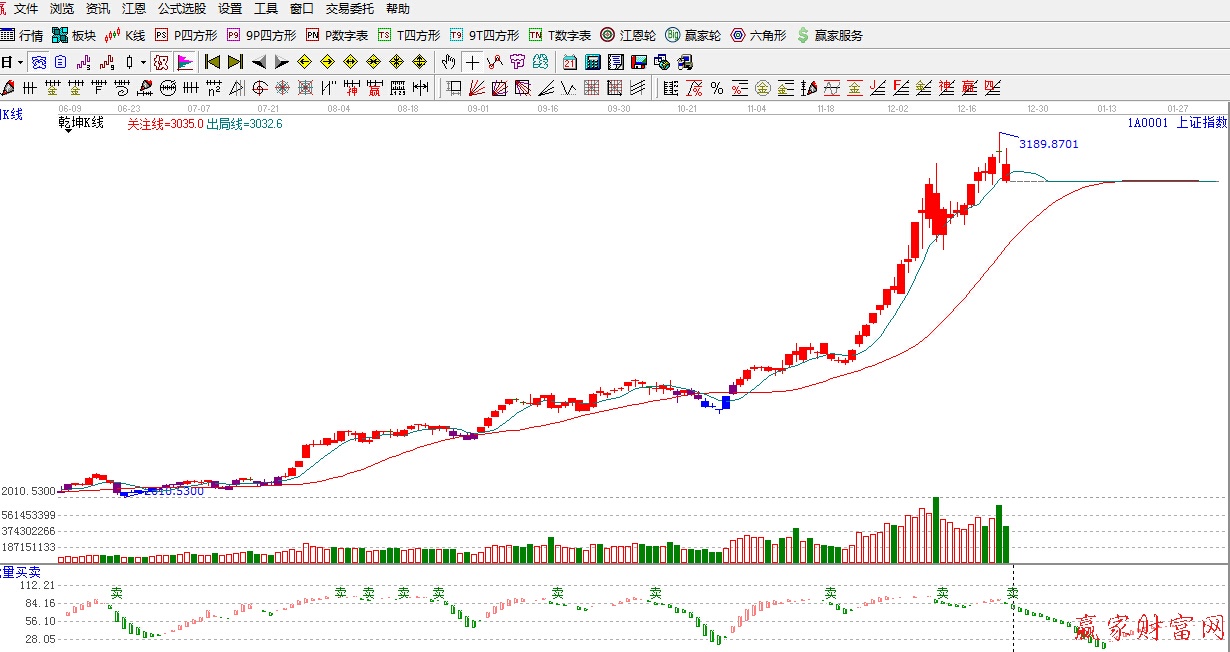 ☆依据赢家江恩系统乾坤K线提示:红色区域,破位绿色出局线,短线看空