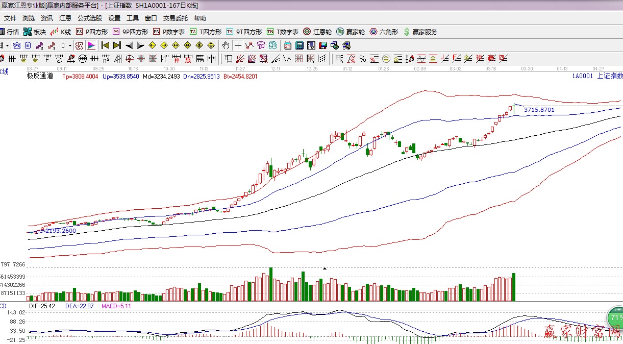 江恩看盘综述:依据赢家江恩技术工具分析得出:今日早盘股指窄幅震荡盘中跳水60点,回踩江恩极反通道蓝色外轨线,随后震荡反弹并翻红,终盘放量十字星报收,市场有其自身的运行规律,罕见9连阳之后,短线震荡调整不可避免,沪指的巨震,主力资金暴力洗盘的概率很大,但今日放量收星对于后期也需留一份谨慎,下一时间窗是3月30日。操作上,逢低关注国资改革、年报超预期个股,对于短线急涨的个股要控制好仓位。