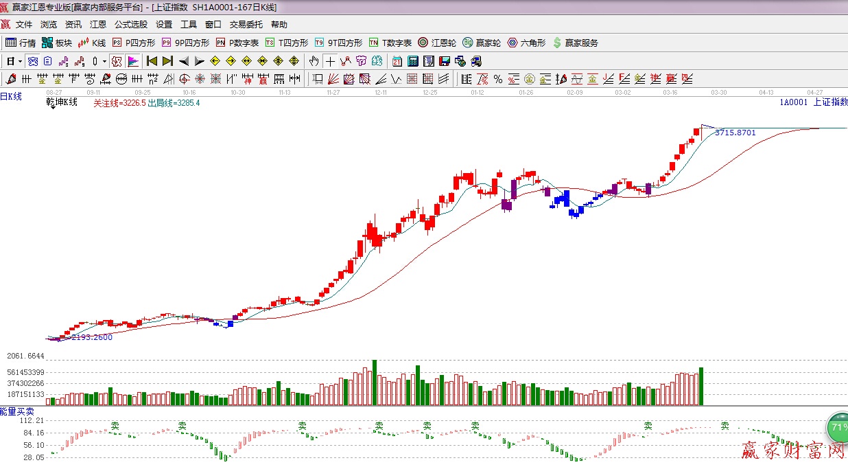 ★依据赢家江恩理论系统乾坤K线提示:红色k线,可操作区域,趋势看多。