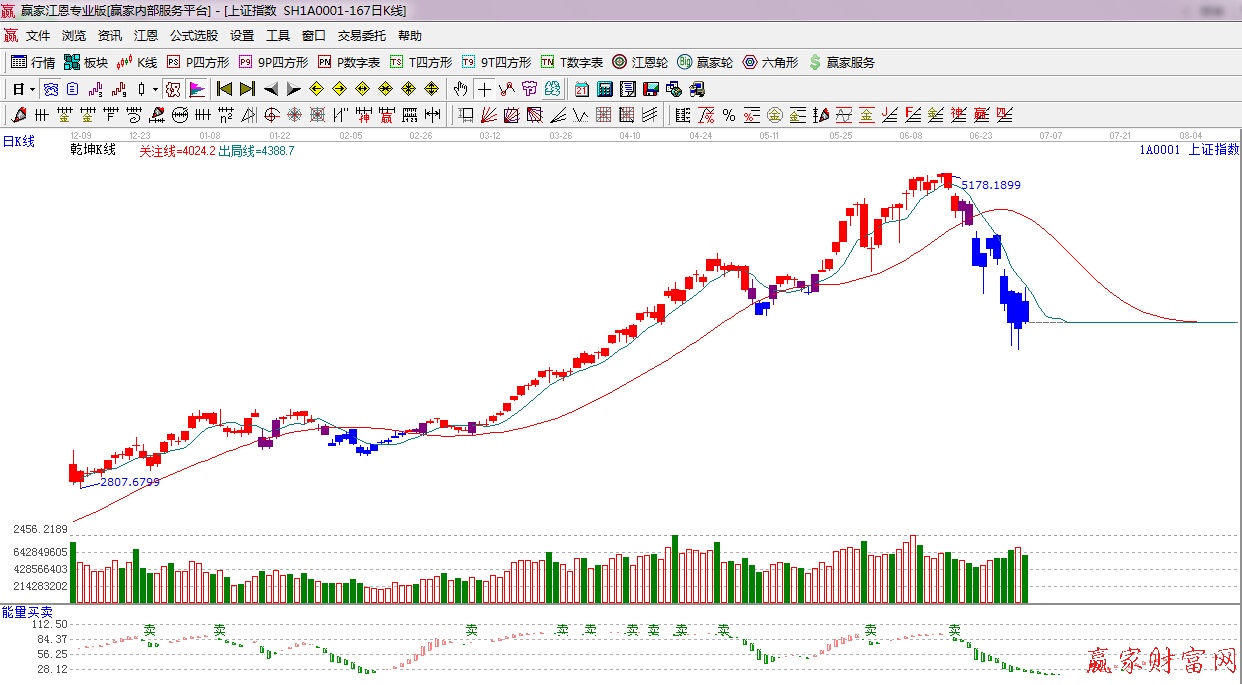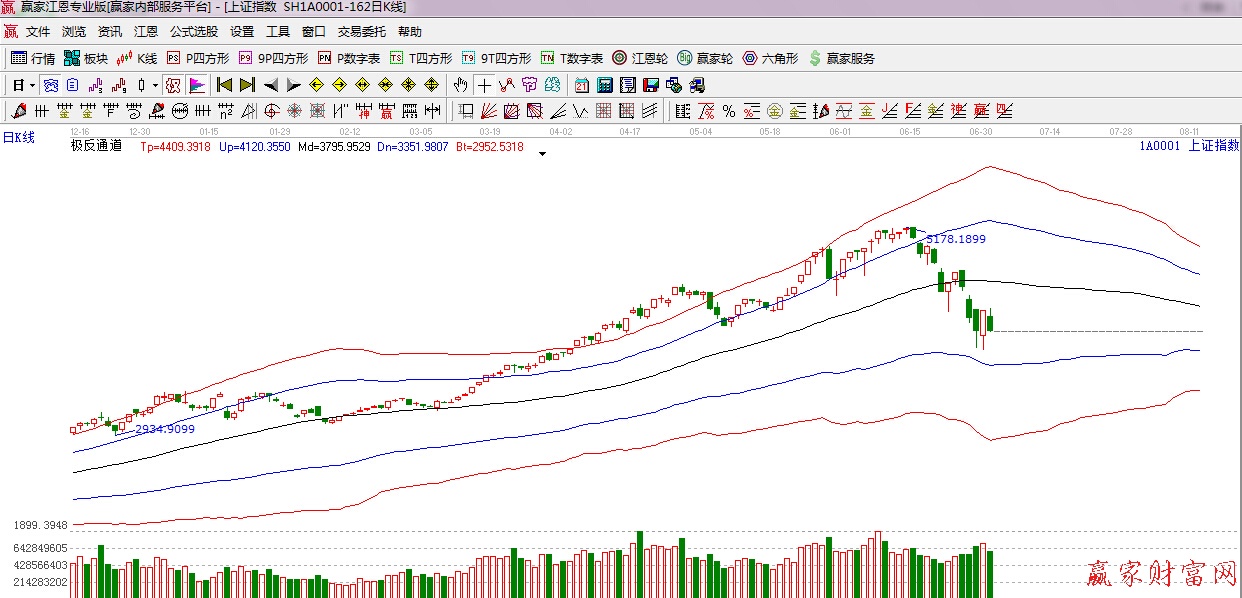 盘面上,各版块全线下跌,机场航运、仪器仪表、福建自贸、白糖等板块跌幅居前,消息面,交通银行收购某证券公司打开银行混业之门,银行以及石油两大权重表现值得期待,将来会为指数反弹贡献主要力量。技术面,经过前期连续暴跌后指数运行至极反通道蓝色外轨线附近,依据物极必反原则,加之救市政策的逐步出台,但夯实牛市基础不是一日反弹就能完成,仍还需要时间来修复,控制好自己的仓位,为迎接最终底部做准备。
