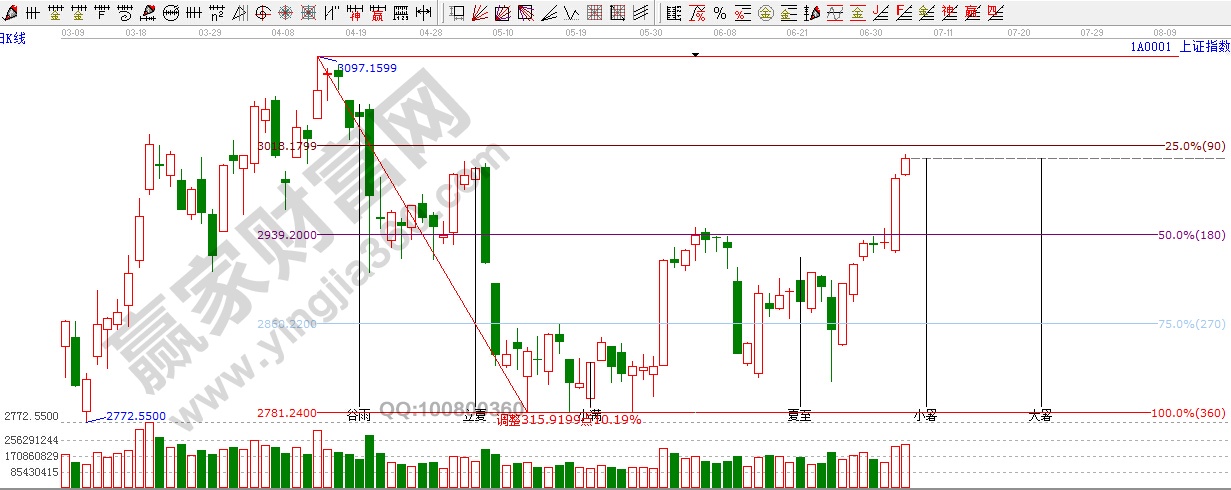 江恩看盘综述:依据赢家江恩技术工具分析得出:市场放量突破箱体顶部后,周二继续上行,最高至3010.27点,接近于提到的江恩90度3018点附近阻力,此位置短期或有反复,但目前成交量配合良好,压力之下回调空间有限,支撑关注2975点,2960点,时间上留意小暑节气7月7日附近,操作上,逢低积极关注中报业绩良好个股,同时关注有业绩支撑的白酒、医药为主的低位蓝筹股。