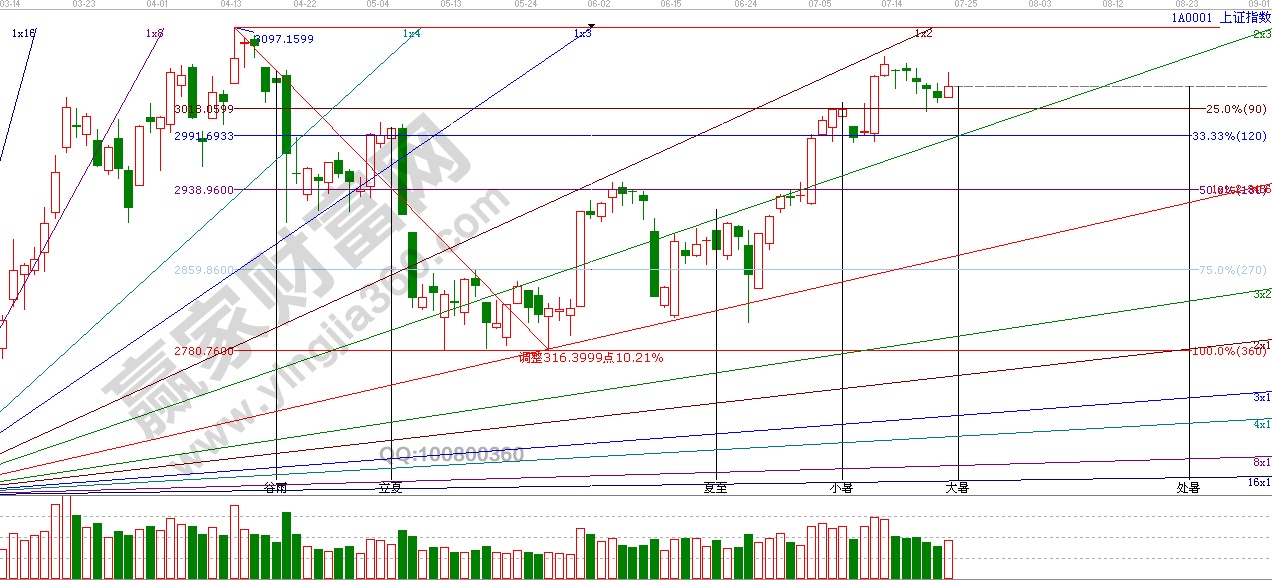 江恩看盘综述:依据赢家江恩技术工具分析得出:周四,是21日时间窗口,两市指数盘中震荡较大,整体成冲高回落走势,最高冲至3053点,由于量能不济展开回落,周五是大暑节气,如仍不能放量收复3055点,3070点的话,预计短期内震荡调整仍为主基调。大暑后下一时间点在8月1日附近。操作上,可梳理半年报相关标的,提前布局具有业绩和数据支撑的高成长绩优股。