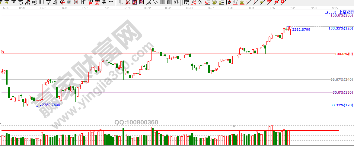 ★依据赢家江恩理论系统江恩波段百分比线提示:沪指3250点遇阻,早盘回探3210后回升,3250转换为支撑位,下一目标位是3326点附近。