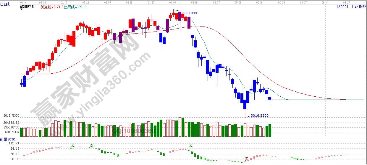 ☆依据赢家江恩理论系统乾坤K线提示:红色关注线、出局线之下,蓝色休息区域,依据规则,控制仓位,多看少动。