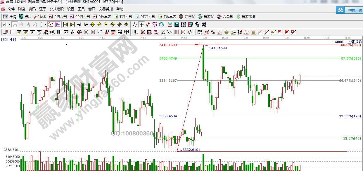 ★依据赢家江恩理论系统极反通道提示:沪指继续在60分生命线上缩量震荡,目前60分生命线是3375点,短线看60分生命线得失,之上看多,之下谨慎。整体大的趋势,关注日线生命线。
