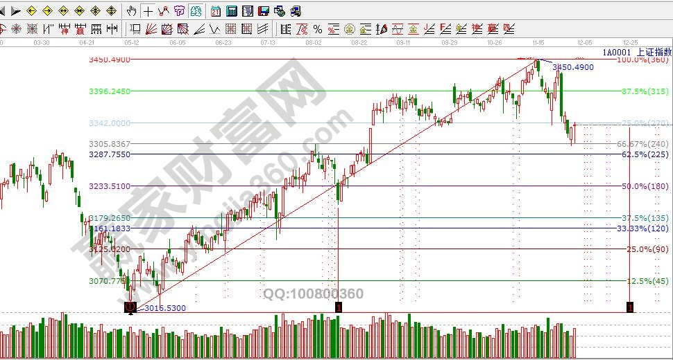 ☆依据赢家江恩理论系统江恩波段百分比提示:沪指再次回探3300点附近,支撑依然是225--240度3305--3287区间附近,暂时以反抽对待,阻力位关注日线270度线3342点,以及短周期3350点--3356点附近。