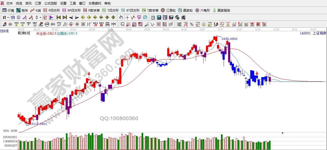 ☆依据赢家江恩理论系统乾坤K线提示:红色关注线之下,再次破位出局线,依据规则,波段趋势并未转变,继续保持谨慎,
