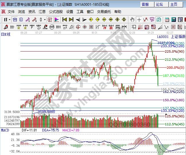 ★依据赢家江恩理论系统波段百分比延伸线提示:270度是3321点盘中获得暂时的反弹,最终权重下挫收盘在此线下方,下方225度与240度震荡带是3280区域,2017年12月份震荡平台处。