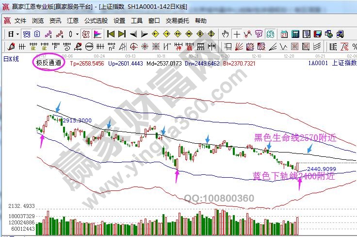 ☆依据赢家江恩理论系统极反通道提示:沪指日K线未触及到波段开仓位蓝色下轨线2400附近时拉升,但盘中发出短线转强信号,确立短线反弹,结合各周期走势,短线反弹目标可看黑色生命线2580附近。