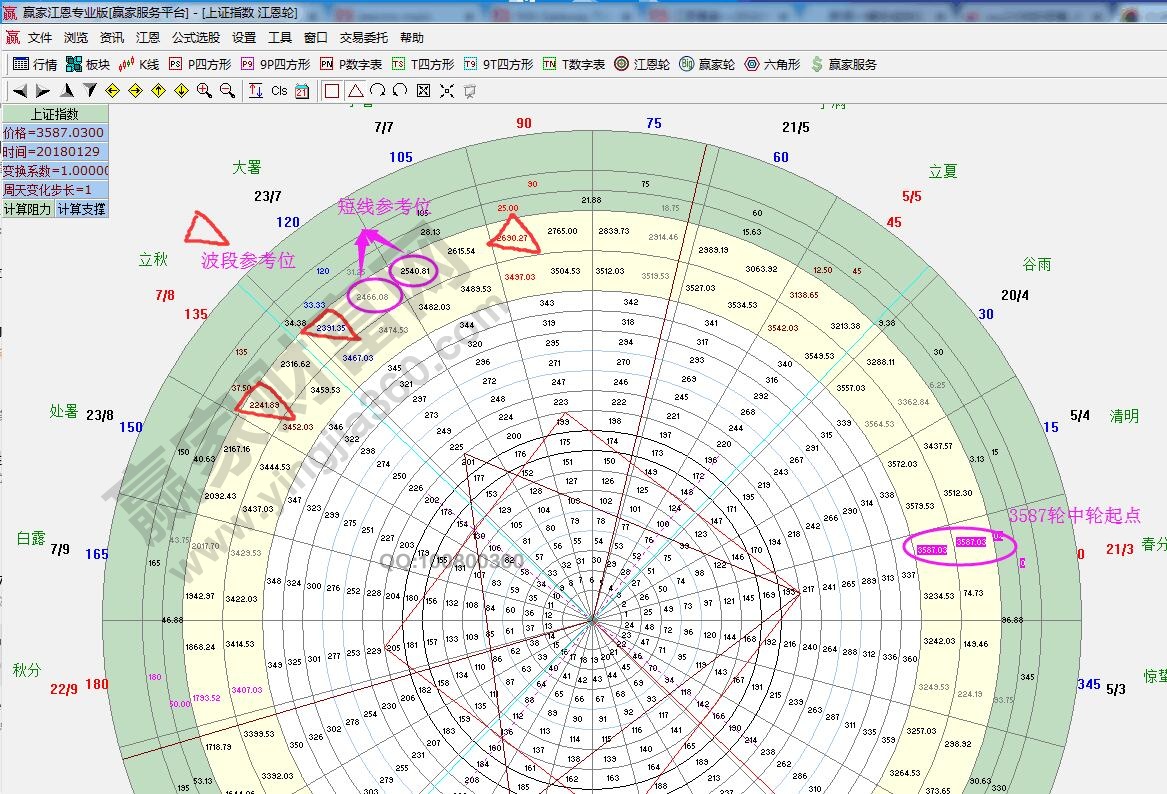 ☆依据赢家江恩理论系统江恩轮中轮提示:江恩轮中轮三角形位置提示短线参考位2466失守后快速收复,短线压力位是2540点。