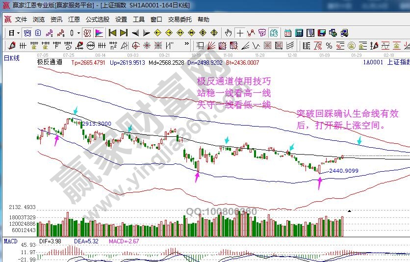 ★依据赢家江恩理论系统极反通道提示:沪指日K线放量突破黑色生命线,后续观察量能持续放大及3天回踩不破,则表明市场反弹打开新空间,站稳一线看高一线,2440的反弹第二目标位可看高至蓝色上轨线2680附近,此结论需满足回踩不破生命线。
