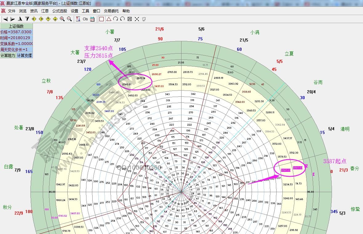 ☆依据赢家江恩理论系统江恩轮中轮提示:以3587为起点做江恩轮上轮时空分析图,当前指数支撑是2540点,上方压力是2615点。