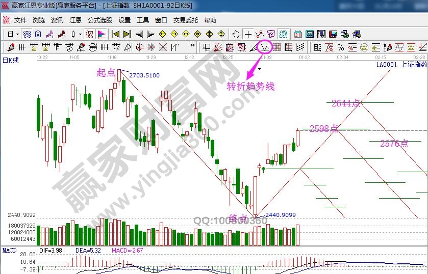 ★依据赢家江恩理论系统转折趋势线提示:以2703为起点,2440为终点做转折趋势线,18号最高点正好的是分析的2598点,21号支撑是2576点,2598点突破上方压力是2644点。