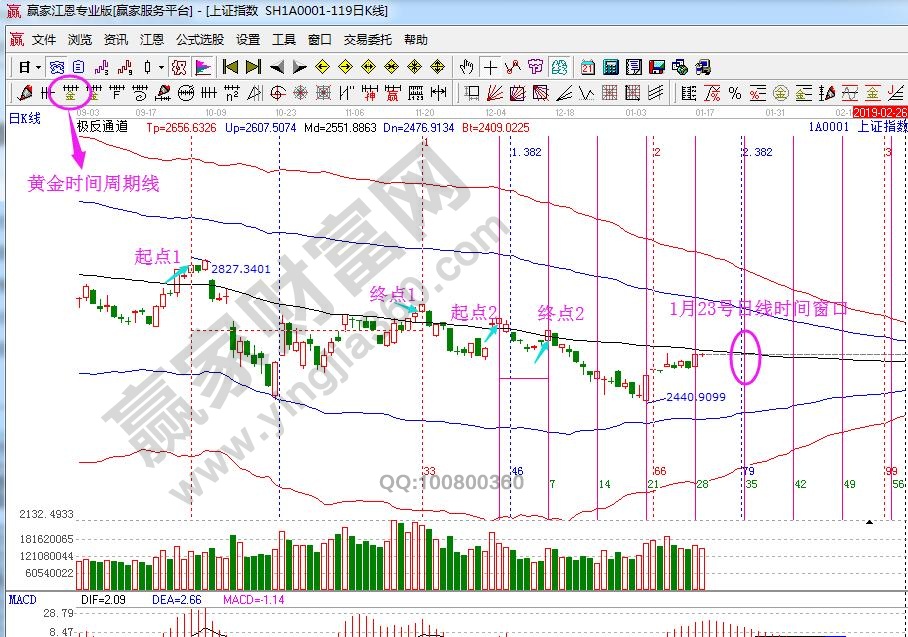 ☆依据赢家江恩理论系统黄金时间周期线提示:以最近两组高高点做图,第一组(2827和2703),第二组是(2666和2645)做黄金时间周期线,下个时间窗口1月23、24号。