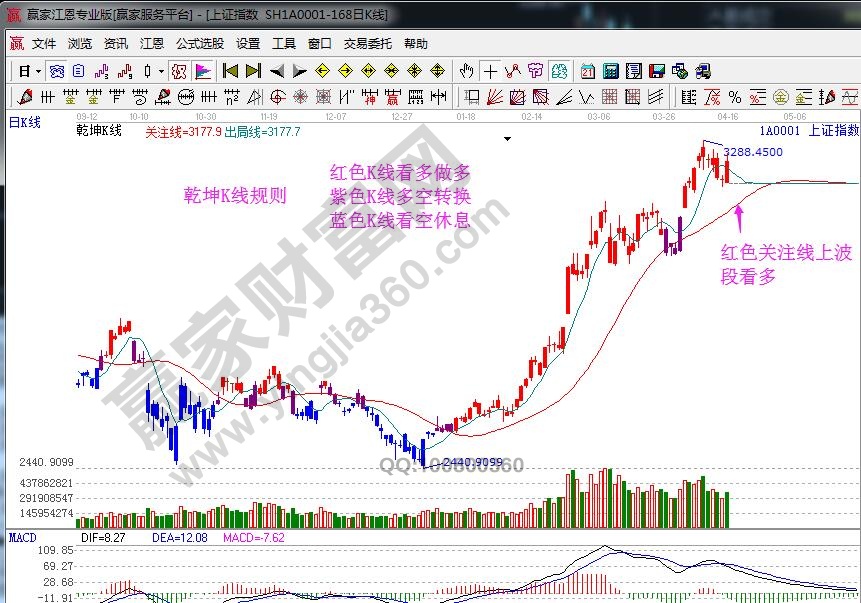 ★依据赢家江恩理论系统乾坤K线提示:日K线整体颜色维持在红色,代表波段可继续看多,K线不破红色关注线按规则看多。