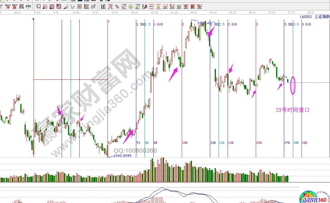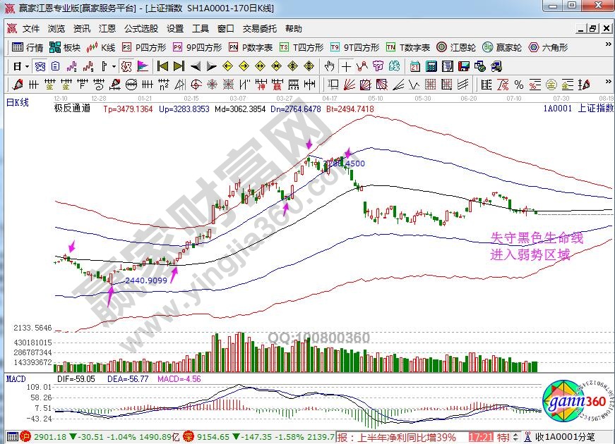 ☆依据赢家江恩理论系统极反通道提示:指数日K线跳空低开失守黑色生命线进入弱势区域,按3天确认、量能原则,未来几天不能收复转弱信号将确立,收盘失守生命线按规则看空。