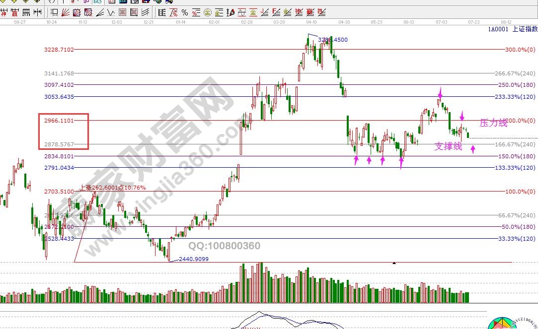 ☆依据赢家江恩理论系统波段百分比延伸线提示:以2440点为起点,2703点为终点做图,指数中阴击破零度2966点后弱势震荡,市场预期再探确认240度2878点支撑,明天关注此线得失,遇此线止跌下周一多个企稳信号。