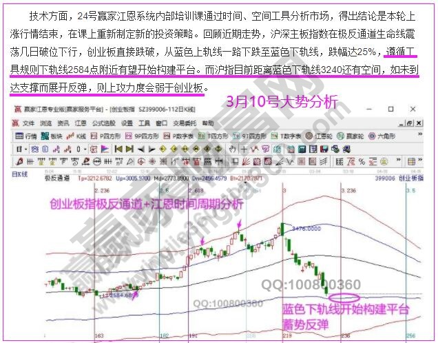 技术方面,周二9号通过趋势工具极反通道对三大指数做预判,谈到未来反弹期间沪指走势会弱于创业板,10号指数收盘涨跌幅印证了此观点,其判断方法是【赢家江恩投资体系】中的“线上支撑线下压力,站稳一线看高一线,失守一线看低一线原则”。9号创业板指数日K线跌至蓝色下轨线支撑附近,而沪指距离支撑还有100多点空间,在反弹期有支撑的上攻力度要比悬空位置强,指数短期拐点是否形成,详见未来行情预判。