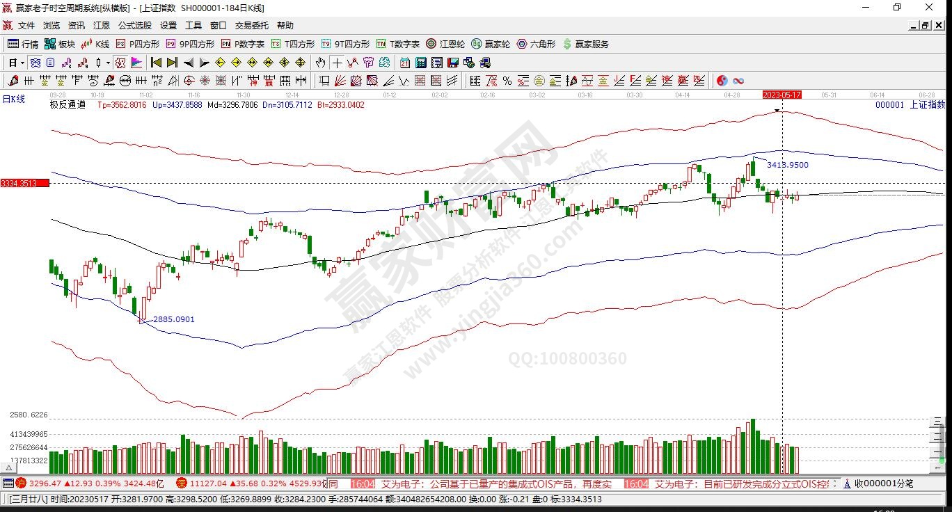 依据赢家江恩极反通道趋势工具展示:指数于5月15日形成阶段低点3235.87点后围绕生命线进行窄幅震荡,当天指数上穿生命线3295.95点,由弱势通道进入强势通道,依据赢家江恩极反通道规则,站稳一线看高一线。若能有效站稳生命线,则有望持续上攻至强势通道线3436.673点附近,若不能站稳生命线,将继续在弱势通道运行。