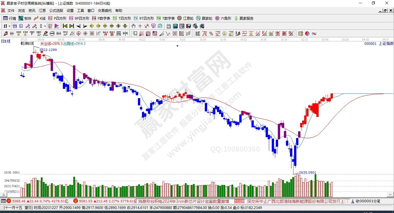 依据赢家江恩乾坤K线工具展示:当天指数以光头小阳线收盘,目前K线处于红色区域(上涨趋势),位于关注线上方,依据赢家江恩乾坤K线多空模型,目前多头出局线对当前指数形成支撑,短期看多。