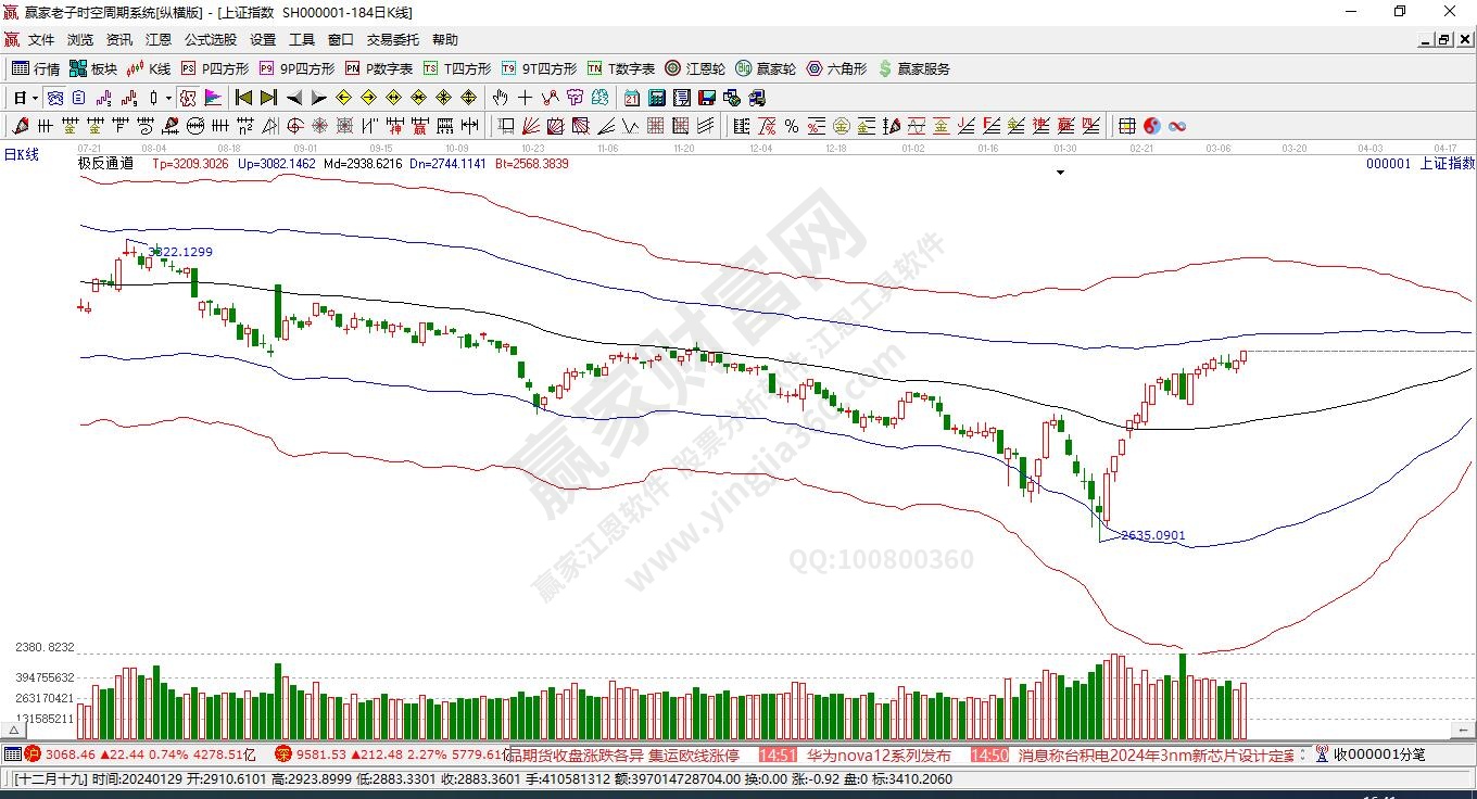 依据赢家江恩极反通道趋势工具展示:指数于2024-02-19突破极反通道生命线由弱势通道进入强势通道内,截止目前在该通道内已运行16个交易日,整体呈现震荡上攻走势,根据极反通道规则,突破一线看高一线。突破生命线2893.67点,上方压力可看高到强势通道线3104点。
