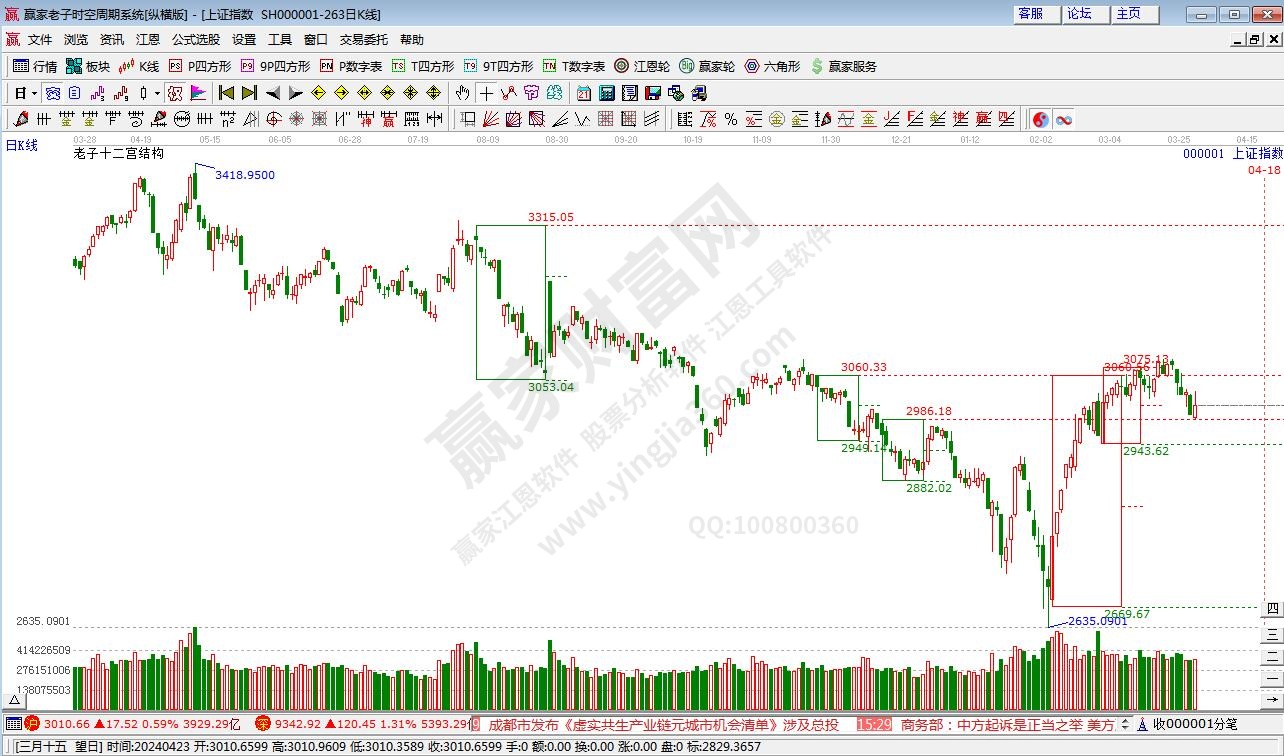 依据赢家十二宫结构模型工具展示:目前指数上穿12日前形成的上涨结构警戒线3009.38点位置。依据赢家十二宫多空能量守恒规则,指数如能继续主导上攻,上方多空能量平衡位关注上涨结构顶部线3075.13点。