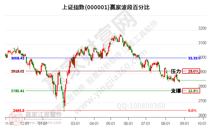 ☆依据赢家江恩波段百分比工具展示:短期处于下行趋势,关注波段百分比工具所显示的下方2782.41点支撑,是否产生底分型信号。