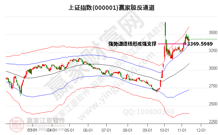 ★依据赢家江恩极反通道趋势工具展示:指数目前处于强势通道,近期下跌至强势通道线3369.5989点支撑附近,关注支撑是否守住,根据规则生命线上强势区域看多。