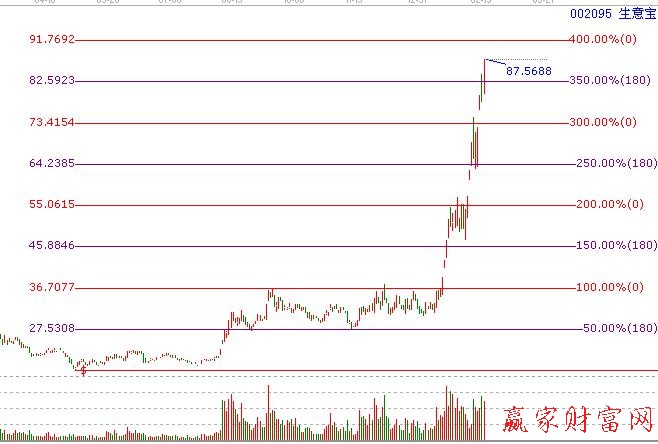 下面以上证个股生意宝(002095)为例,来看下这个股票的市场结构是怎样的。以2014年4月29日的低点18.35为起点,做出