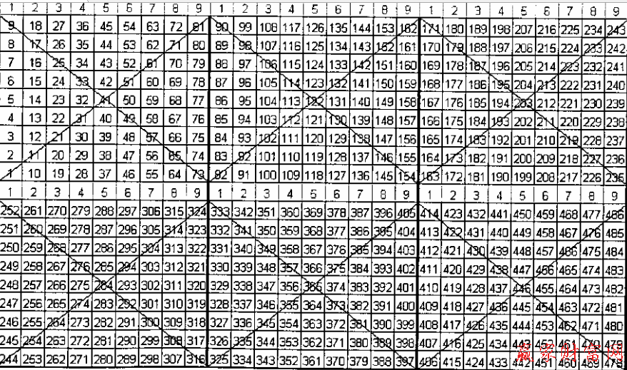 江恩九方形中蕴含着多个9*9的方形结构,9*9=81,完成了第一个九方图。结合下面的图形,注意它们的位置以及它们是如何开始的。第一个九方在81结束;第二个九方在162结束, 注意第二个九方的旋转方向,正好是和第一个中心九方形相对立;第三个九方图的结束位置是243,243个月比上面提到的20年周期多出了3个月。经过大量的统计市场,无名会发现时间经常运行在3个月或3个月以上;第四个九方图的终点是324, 325刚好处在45的角度,这表面了变化的周期在这个位置。要完成 360°需要4个九方图和36以上。这里需要强调,361 等于19乘以19,也就是360度相当于19*19的方形, 要细心观察市场是如何以重要的角度运行在九方形伟大的数字中,更要注意其中的差异。