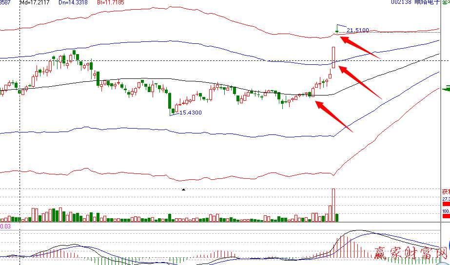 首先,我们通过极反通道来分析一下该股目前状况。如下图所示,该股前期一一直在生命线下徘徊,生命线一直是股价上涨的阻力线。较大阻力作用下并没有形成有效突破。最终在生命线下附近经过一段时间的蓄势,2014年5月30日大阳线拉起,之后成功站稳生命线,之后连续小阳线实体拉升,,股价逼近强势区。小阳线拉升之后,iPhone6对外宣布将支持NFC,NFC天线将成为手机新标配。2014年6月10日受这一利好消息刺激,大量资金融入,实力机构看好。昨日股价大幅跳空高开,当天金板涨停。此次跳空高开意义非凡,股价突破强势外轨线,上涨空间又一次打开,今天的跳空高开直接突破超强外轨线,顺络电子再次创下自年初以来的股价新高。