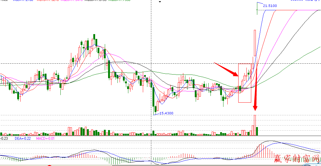 如果觉得上图指标还不充分,接下来我们来用均线趋势指标来验证一下。如下图所示,在日K线下,该股前期出现了底部的横盘整理行情。整体来看股价前期一次波浪走势,拉升之后出现回落,进入横盘震荡,成交量萎缩。横盘缩量两周之后2014年5月30日出现一阳穿多线,均线首次出现粘合发散状态。均线多头排列,形态确立非常完美,是一个非常好的买点,利好消息的刺激下放量涨停,实现巨幅上涨。