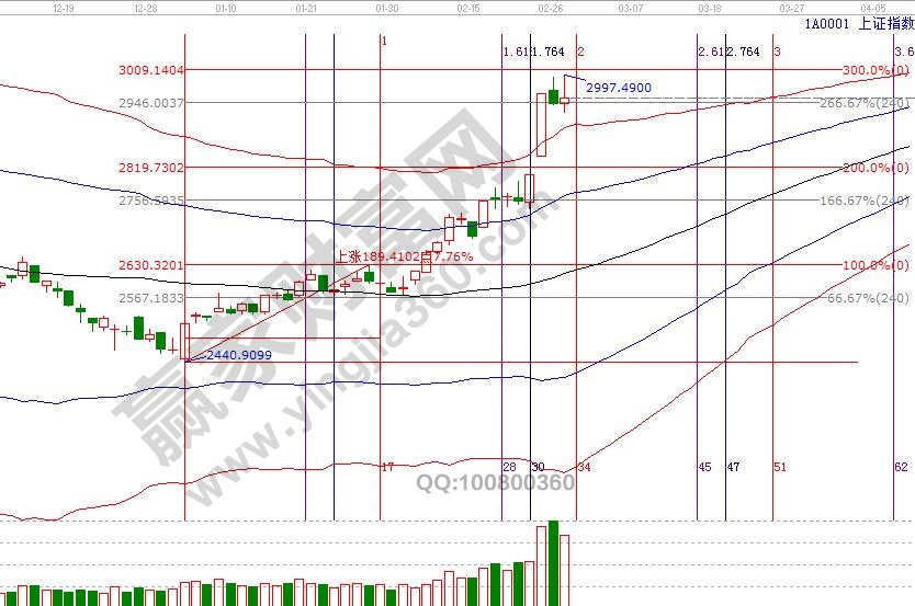 28号是大盘日线时间窗口,继续观察市场横盘后短线方向选择,依据规则红色外轨线为短线风险区,空间点位上,江恩百分比、价格四方形显示,28号2914、2925点为支撑,2974、2999点为压力,3月份第一个时间窗口是7号。操作策略,大盘日K线突破红色外轨线,注意时间窗口后遇反压力风险,持股上享受疯狂的同时不断提高止赚位策略,即保护了利润又可将利润最大化,或主动分批高抛红色外轨线个股,抛售仓位等待市场回归通道内在做决策是否参与,整体仓位保持在6成左右。