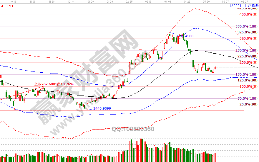 5月指数三次下探一直强势的关键位2840点,分别是8(9)号、20号及27号,9号及27号下探按工具信号做了明确的参与信号,指数延续昨日上攻动作走高,盘中在赢家江恩系统工具VIP学员群提示,反弹进入第一目标2928-2960(15分钟蓝色上轨线)可先获利了解三分之一筹码,待量能有效配合突破波段百分比零度位2966后再看高至生命线,29号是5月最后一个时间窗口。29号盘中压力是225度2944点、180度2928点,盘中支撑是45度2877、0度2860点。操作策略,指数击破黑色生命线进入弱势区域,整体持仓保持在3-5成。